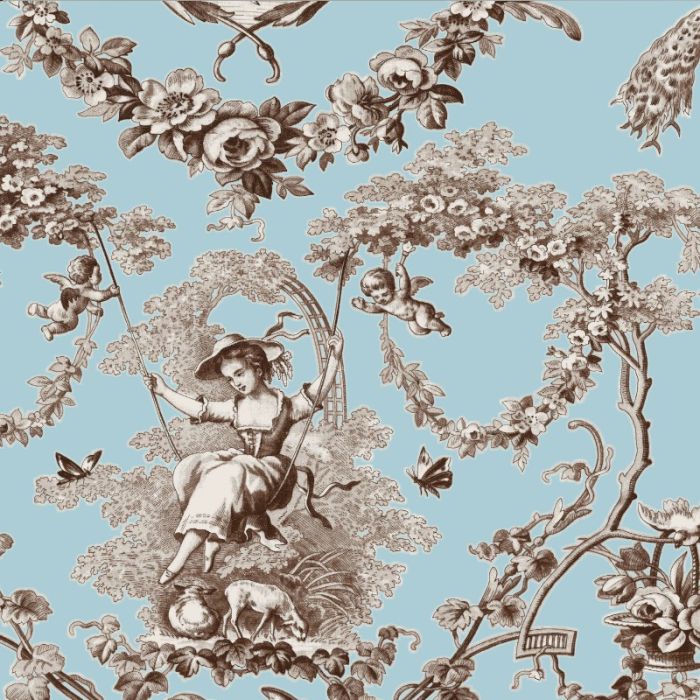 Quand la maison Thévenon revisite par la couleur l'un de ses imprimés vedettes, cela peut donner « Ludivine fond bleu », une toile de Jouy bucolique des dégradés de bruns cacaotés se détachent sur un bleu dragée frais, propre et doux. Une très bonne idée en rideaux, coussins, tête de lit ou parure de siège pour décorer une chambre d'adultes ou d'enfants et ressentir l'impression d'avoir fait entrer un petit coin de ciel bleu ou un morceau de rêve ! Et comme la toile de Jouy Ludivine respire le bonheur de vivre, il est aussi permis de penser à elle pour célébrer les moments heureux : mariage, baptême. avec une nappe, des galettes de chaises, des pochons à surprises.