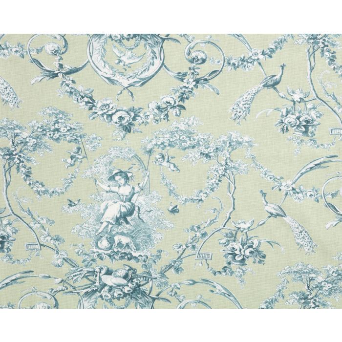 Un joli vert macaron enveloppe la demoiselle aux bouquets fleuris et à la balançoire légère pour cette revisite de la toile de Jouy best seller de la marque Thévenon « Ludivine ». Une touche de bleu-vert océan chatouille le romantisme de l’ensemble pour le rendre plus actuel et dynamique.