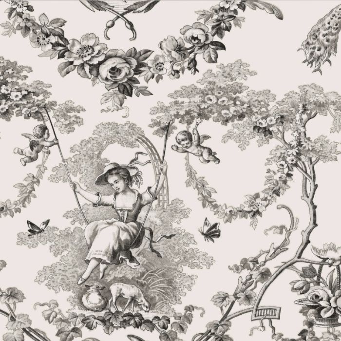 Tout le charme décoratif et porteur d'histoires de l'imprimé toile de Jouy est à votre portée pour vos rideaux, coussins, stores, ou jetés, dans un coloris noir et blanc donnant un ton absolument contemporain, sobre, chic et affirmé. La toile de Jouy Ludivine est un modèle star des collections de l'éditeur haut de gamme accessible Thévenon. Qui saurait résister à l'ambiance de rêve enchanté qui se dégage de cette scène printanière une jeune demoiselle se laisse bercer par sa balançoire, entourée d'anges, d'oiseaux, de paons et de fleurs?