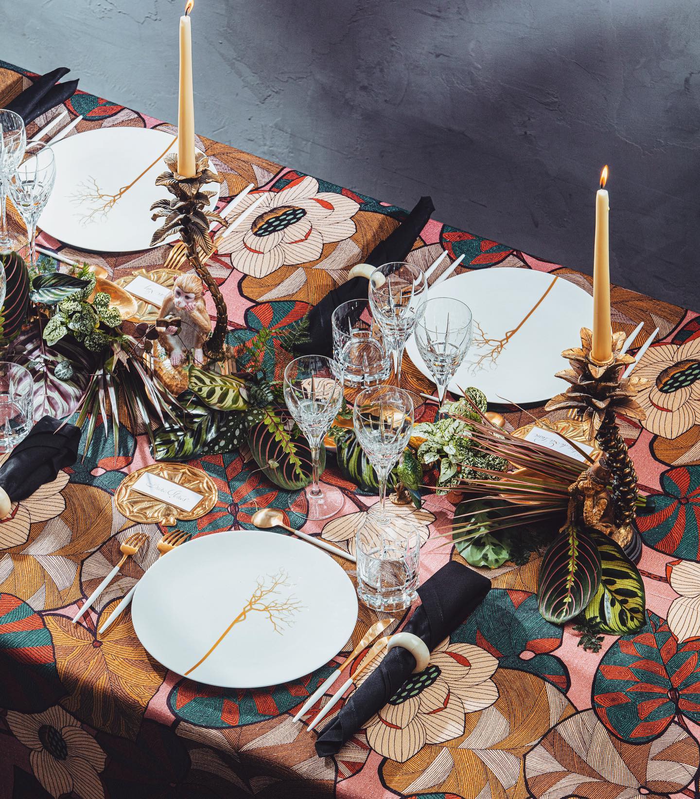 N’ayez pas peur d’avoir la main un peu lourde : une approche baroque donne le côté festif à cette mise en scène de table de réveillon. L’idée étant d’obtenir une table spéciale qu’on ne verra plus ailleurs ou à un autre moment. Créez de beaux souvenirs pours vos convives !