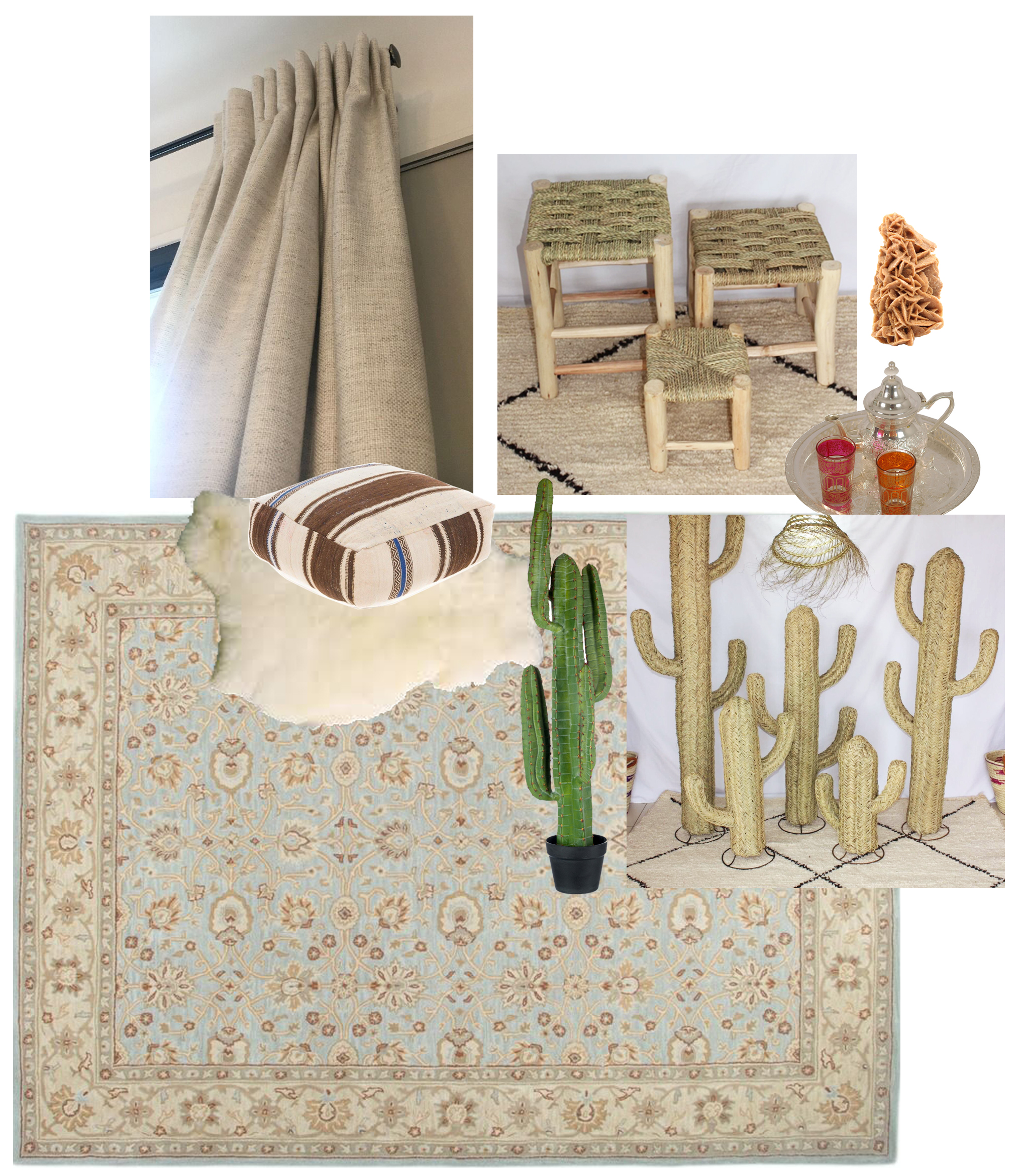 Pour relier plus clairement votre déco beige sable au thème du désert, vous devez caractériser davantage, avec des éléments de déco plus figuratifs. Nous vous proposons d’introduire un grand cactus en pot ou un cadre montrant un cactus (affichette, photo, poster), d’accrocher au mur un tissage mural à pompons dans les tons d’écru / beige, de disposer au cœur de l’ambiance un pouf marocain en cuir ou kilim, ou une série de quelques coussins de sol donnant envie de s’asseoir par terre. Sortez si vous en avez de la vaisselle à motifs marocains ou un service pour le thé à la menthe, avec ou sans (mais avec, c’est très joli) plateau en argent gravé. Au sol, un tapis à grosses mèches de laine tissées ou tapis à motifs berbères, une petite fourrure blanche façon peau de mouton.