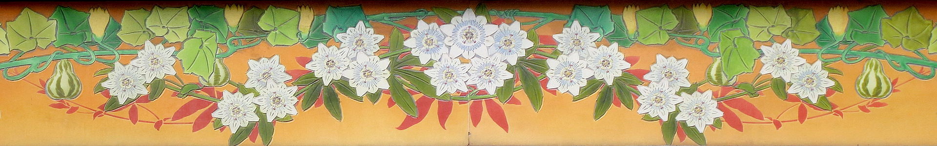 Ce décor végétal fait de tiges souples entrelacées et de feuilles précieuses est typique du style Art Nouveau, courant du dix-neuvième siècle pendant laquelle la nature, foisonnante, vivante et ornementale, est omniprésente, et au cœur de l’inspiration de tous les métiers d’art (ferronnerie, verrerie, vitrail, bas-relief…).