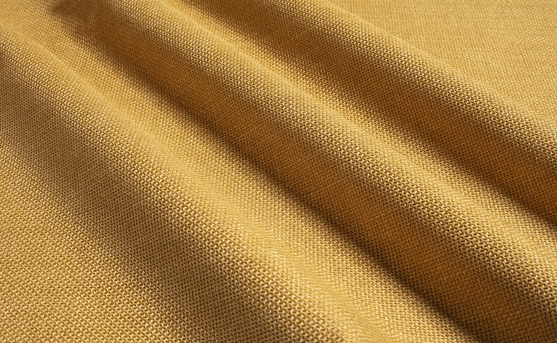 Ici, les motifs sont tissés, et c’est cette technique jacquard qui donne une étoffe cossue, luisante, d’un jaune orangé délicieusement chaud.