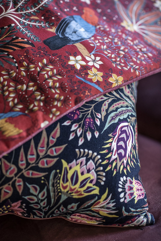 Sur le tissu « Le jardin du Palais » signé Pierre Frey, un tigre se repose sous l’ombrage d’un arbre croulant sous les fruits mûrs, et d’un autre empli de fleurs disposées en grappes généreuses d’un rose coquet, tandis que volent et marchent des oiseaux (hérons, flamands), et que les gazelles ne sont pas inquiétées.