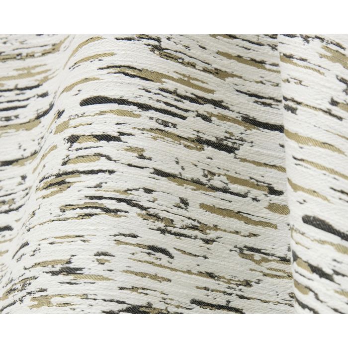 Quelle formidable idée de la part de l’éditeur Lelièvre d’avoir inventé ce tissu jacquard aux effets de textures et matières variées pour retranscrire l’apparence de l’écorce des bouleaux, afin d’en revêtir les intérieurs en une véritable communion du dedans et du dehors. Chaque fil présent a un rôle à jouer. Le coton flammé (irrégulier dans son épaisseur) crée un effet généreux, dense et aléatoire. Un fil sombre dessine des graphismes abstraits comme des lignes interrompues, des tâches, des creux. Un fil doré conduit la lumière dans cet ouvrage et en fait un bijou contemporain. Viscose, polyester, coton et lin travaillent de concert pour ce tissu exceptionnel, véritablement unique.