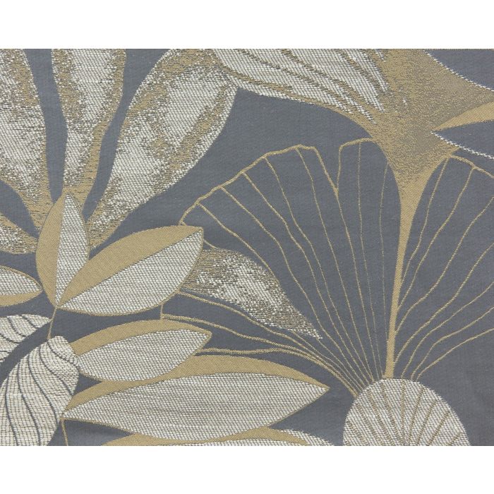 Sur un fond coton mat de couleur bleu gris, les fils de viscose déposent des accents dorés sur de vastes motifs végétaux, souples et légers, tantôt remplis d’écru, tantôt juste tracés et laissés librement à l’état de contours. La jute, matière végétale plus rugueuse, apporte son grain particulier contradictoire. Cette étoffe lourde très travaillée donne un ton prestigieux aux intérieurs en rideaux, coussins, tapissage de sièges, tenture murale. Lelièvre exprime ici tout son savoir faire de tisseur historique.
