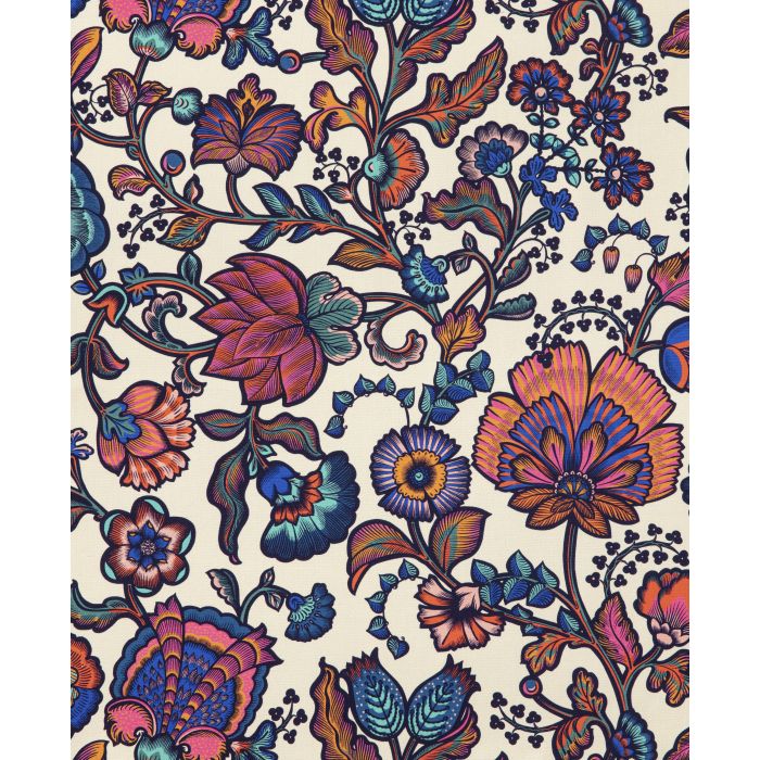 Connotation retour de voyage et tradition rehaussée en couleurs avec cette superbe indienne imprimée sur coton présentant un gros motif floral ornemental sur fond crème (un écru chaud).