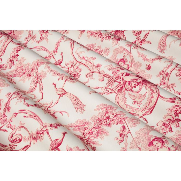 De nouveaux coloris, corrigés, adaptés ou réinventés, de la mythique Toile de Jouy Ludivine, éditée depuis des décennies par la maison Thévenon, voient le jour sur le support gracieux qu’est la percale de coton. Que ce soit sur un orange clémentine, un bleu dragée, un rose maquillage, un vert de gris bleuté, un beige corde foncé ou un écru intemporel, la demoiselle n’a pas fini de se balancer. Toujours et jamais la même.