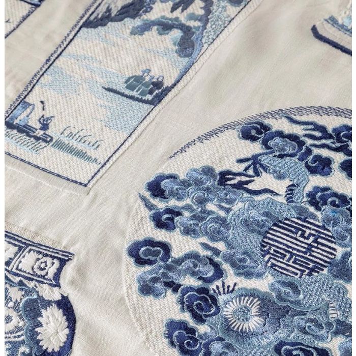 Maxi motifs brodés reproduisant des vases de porcelaine traditionnels chinois somptueux, en fils viscose (les bleus, aux reflets brillants soyeux) et coton (le blanc mat dans le fond des vases), sur fond lin blanc, fin, tissé serré, ce thème convient aux décorations classiques auxquelles il apporte sa fraicheur de coloris. Les vases apparaissent plus opaques et denses que le fond du tissu, qui sans être un voile prend la lumière en transparence.
