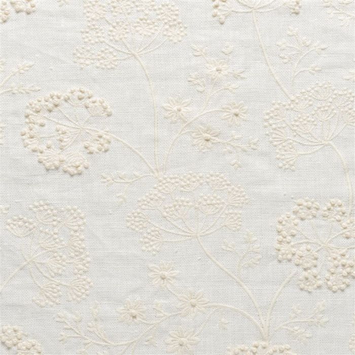 Un pur lin blanc cassé lourd délicatement brodé en blanc avec des fleurs. Les nœuds français sont combinés à une variété de techniques pour créer un tissu élégant et un luxe décoratif discret. Un seul coloris sophistiqué. - COLLECTION Moselle Lino