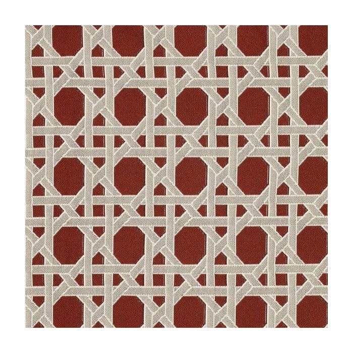 Le tissu outdoor Cannage Californien se décline en différents coloris, avec des fonds écru lumineux ou des fonds colorés denses. Ici, le terracotta est à l’honneur et fait ressortir les vides entre les lignes du maillage graphique du dessin.