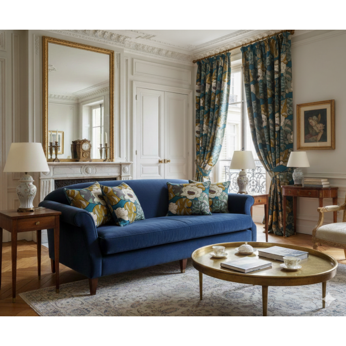 Des coloriages surprenants et inventifs donnent à ces maxi nénuphars aux feuillages remplis de graphismes linéaires hypnotiques un air d’imprimé wax à l’exotisme curieux. On pense aussi bien aux boubous, au batik indonésien qu’à l’Art Nouveau. Un univers fantastique hybride décliné de la simplicité du coton à la chaleur du velours, en passant par le charme naturel du lin.