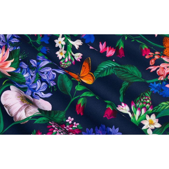 Dans un monde idéal, où la beauté n’a pas de raison, la paix ne nait-elle pas au pied des fleurs ? Le jardin n’est-il pas le terreau de la sérénité et de la joie ? Ces motifs fleuris – agapanthes, dahlias, anémones, cyclamens, glaïeuls d’Abyssinie - prônent l’énergie vivante et radieuse de la couleur, qui arbore des variations multiples comme autant de coups d’éclats : bleu roi, rose fuchsia, mandarine… A vous de choisir l’ambiance déterminée par le fond : lumière crue et simplicité avec le fond crème, suavité du couchant et accents fruités avec le fond framboise, tombée de la nuit sur fond marine, souveraineté du végétal avec un vert profond.