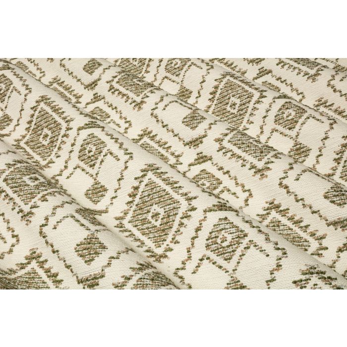 Les fils épais, poilus, s’insèrent dans le tissage en formant de petites bourrettes rondouillettes, formant un tissage jacquard poids tapisserie. Au verso, les couleurs s’inversent : les motifs deviennent écru sur un fond vert / beige.