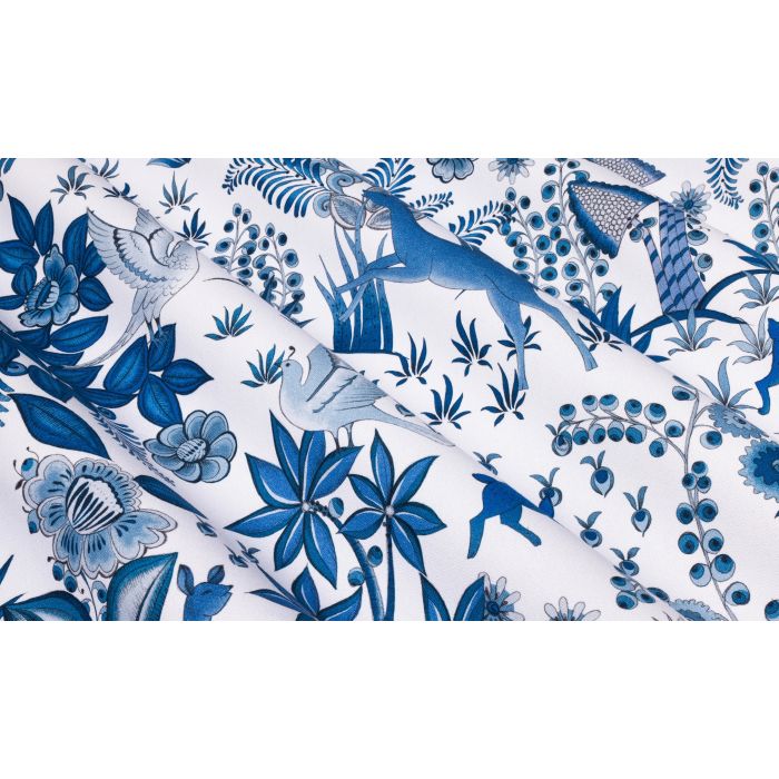 Biches, oiseaux et lapins parmi les fleurs, traités dans un style naïf et folklorique, semblent issus d’un conte sans âge. Ils revêtent des coloris de faïence ou de lumière dorée pour les versions en camaïeux, mêlées entre elles et accompagnées d’un ton framboise dans la version multicolore. Les vides entre les scènes sont comblés de petits motifs régulièrement répartis pour une composition équilibrée et foisonnante.