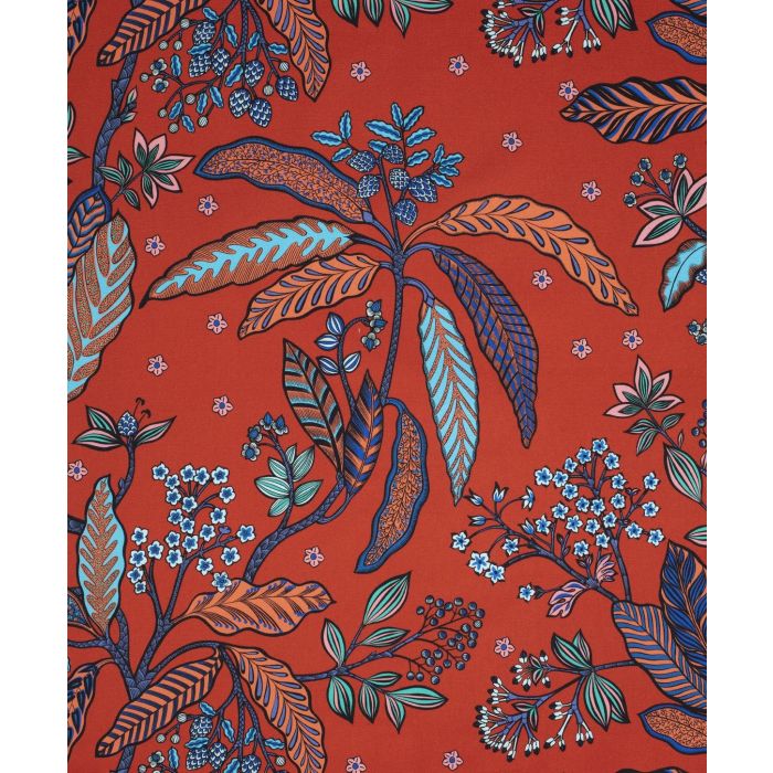 Fond rouge subtilement dosé entre le vif et le brique, fleurettes bleu ciel aussi lumineuses que des lucioles, bleus turquoise et outremer, orange doux. Il y a un petit côté laque chinoise dans ce coloris du dessin végétal fantaisiste Bibi qui nous emmène en voyage. Feuilles et tiges sont emplies de lignes, réseaux, motifs courbes, qui insèrent un caractère graphique dans ces formes alanguies.