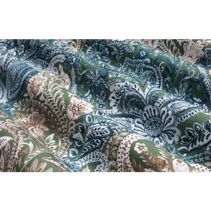 L’imprimé foisonnant de détails d’inspiration Perse Caprice s’illustre ici sur un fond vert bien présent mais non vif, un vert à marier par exemple aux verts sauges très présents dans les tendances de peinture. D’autres coordinations couleurs qui fonctionnent bien avec ce modèle : blanc, écru, crème, ficelle, taupe, marine. Caprice existe dans cinq coloris ayant chacun leur caractère.