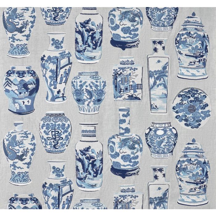 Maxi motifs brodés reproduisant des vases de porcelaine traditionnels chinois somptueux, en fils viscose (les bleus, aux reflets brillants soyeux) et coton (le blanc mat dans le fond des vases), sur fond lin blanc, fin, tissé serré, ce thème convient aux décorations classiques auxquelles il apporte sa fraicheur de coloris. Les vases apparaissent plus opaques et denses que le fond du tissu, qui sans être un voile prend la lumière en transparence.
