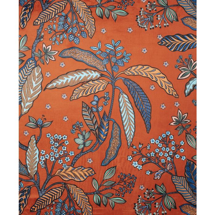 L’impression sur velours ras offre une très belle précision du dessin alliée à un toucher doux et un aspect luisant. Avec son fond orange optimiste, ses motifs bleus frais et lumineux, voilà une variante du modèle Bibi particulièrement enjôleuse. Le velours accentue la connotation orientale du dessin.