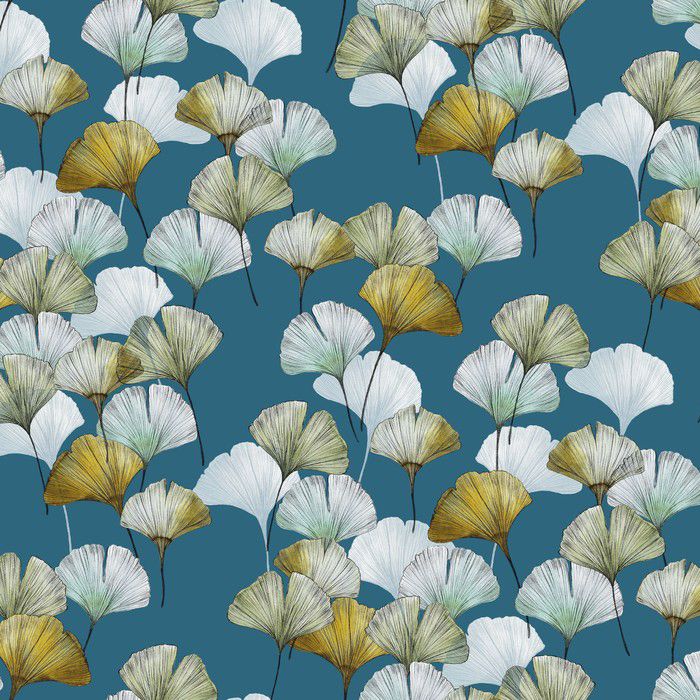 Les feuilles en éventails du Gingko Biloba s’imbibent de couleurs éclatantes et raffinées que la lumière vient illuminer en transparence. Les fonds bleu zinc, ficelle, bleu canard ou jaune cumin entraînent le dessin vers des ambiances variées, où le ciel s’emplit de fraicheur poétique, de poussière sablonneuse, de tombée de nuit ou de chaleur safranée. Le support coton épais qualité siège vient donner de la consistance à cette histoire de finesse et de légèreté.