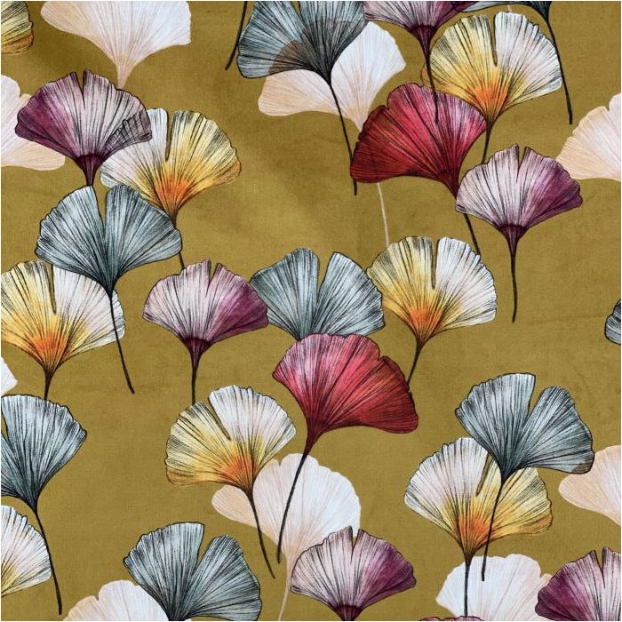 Les feuilles en éventails du Gingko Biloba s’imbibent de couleurs éclatantes et raffinées que la lumière vient illuminer en transparence. Le fond velours noir apporte son mystère opaque et sourd, ainsi qu’une connotation asiatique, tandis que le fond velours jaune cumin nous entraine en Inde, pays des épices où le soleil semble d’or.