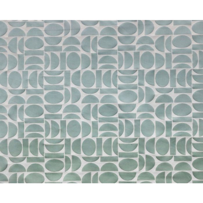 Fjord céladon est un tissage à léger effet de relief aux motifs arrondis et rectangulaires pleins, comme des blocs et quartiers de lune agencés en construction ludique mais sagement réfléchie. Une fantaisie vintage et graphique qui rend hommage à la Scandinavie et ses jolis tons givrés, à confectionner en rideaux, coussins, sièges, et associer librement aux autres modèles de la collection Borealis par Lelièvre, comme Taïga neige ou Helsinki naturel.