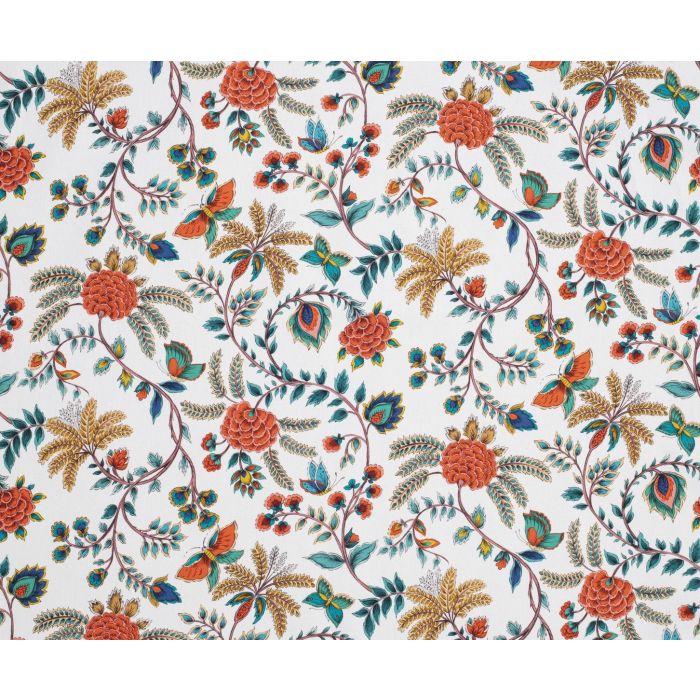 Ce tissu imprimé sur coton blanc éclatant nous parle de candeur, de générosité, de fertilité, avec ses fleurs rondes et épanouies, ses papillons, ses branches de feuilles et fleurettes acidulées. Les tiges sinueuses dessinent de coquets entrelacs. Tout tend vers l’ornementation, avec une inspiration issue de l’art Perse. Jaune d’or, turquoise, bleu mer, corail, pêche : les coloris variés et pétillants sont un régal pour les yeux.