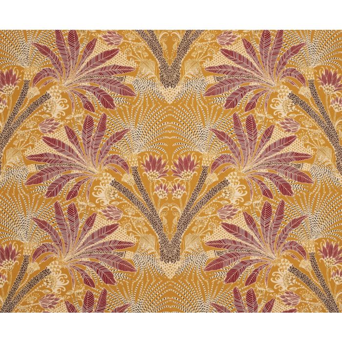 Maximaliste et très décoratif, l’imprimé Grand Hôtel sature tout l’espace de motifs eux mêmes incrustés de plus petits motifs, explosant en feux d’artifices avec symétrie sur un fond jaune or (jaune foncé orangé) riche, suave, généreux. Des tracés clairs sur surfaces colorées donnent l’effet d’un dessin réalisé « en réserve » (comme les batiks indonésiens travaillés à la cire). Palmiers et fleurs façonnent ce décor kaléidoscopique et enivrant.
