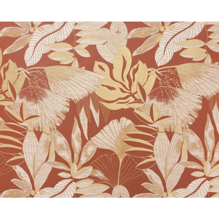 Sur un fond tissé coton couleur rouge brique s’alanguissent les majestueux motifs végétaux, feuilles de gingko, feuillages divers, en éventails vastes, polylobés, symétriques et effilés, oblongs ou sinueux. Ecru, beige mat, beige ocre doré, se rencontrent, se recouvrent, se cisèlent, se strient. La jute apporte sa matière fibreuse, la viscose son soyeux métallisé. Savante recette de somptuosité, digne d’un kimono ancien ou d’un costume de cour ; en dépit d’une modernité dans le dessin.