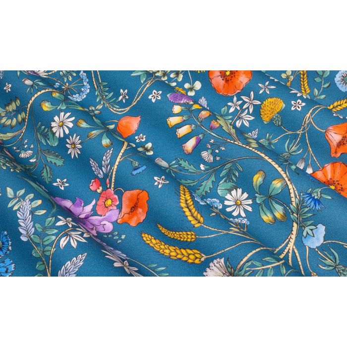 Coquelicots, anthémis, myosotis, digitales, campanules, bleuets, achillées, épis de blés, cherchent belle des champs pour partager des confidences à voix susurrée ou intérieure, dans un décor sauvage traversé de parfums éphémères, sous le soupir mélancolique d’un vent léger et timide. Une harmonie champêtre proposée en multicolore sur fond bleu orageux, couleurs pimpantes sur écru éclatant, camaïeux bleus grisés sur orange rougi façon tomette, ou encore pastels tendres sur vert d’eau cristallin et innocent.