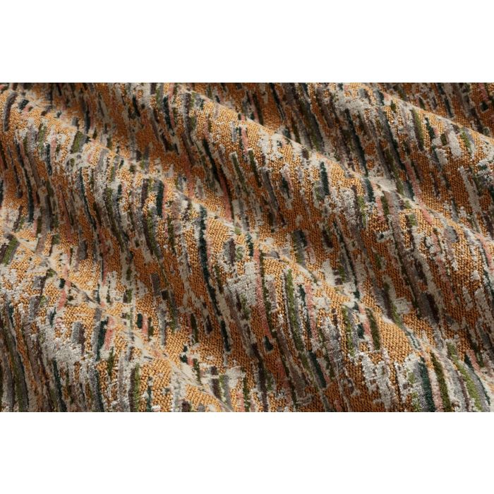 On ne saurait vous dire si Koons est un faux uni ou un motif abstrait, il est unique ! En effet, il est constitué d’un assemblage de tâches, traces, traits, dans différentes couleurs mais aussi différentes textures (tissage toile, velours…). Le coloris fond ocre pourrait être décrit comme un orangé entrecoupé de grège, ficelle, marron, pêche et deux nuances de vert.