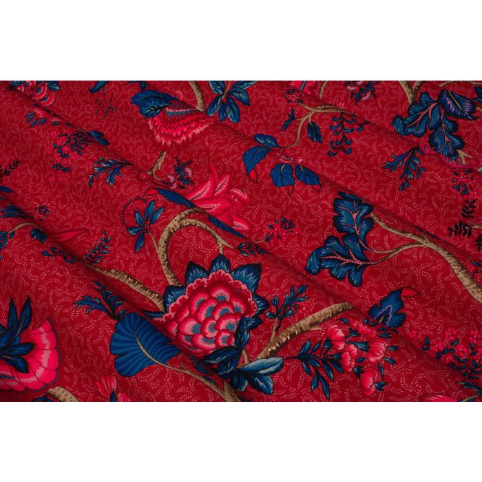 Dans le style du dessin Alexandra où paressent les paons, Monte Cristo présente de belles fleurs opulentes couleur framboise greffées sur des branchages sinueux. Les couleurs des fonds sont denses, sophistiquées, avec un bleu foncé verdi (pétrole), un vert foncé bleuté (émeraude), un bordeaux sirupeux, comme un coulis de fruits rouges (framboise).