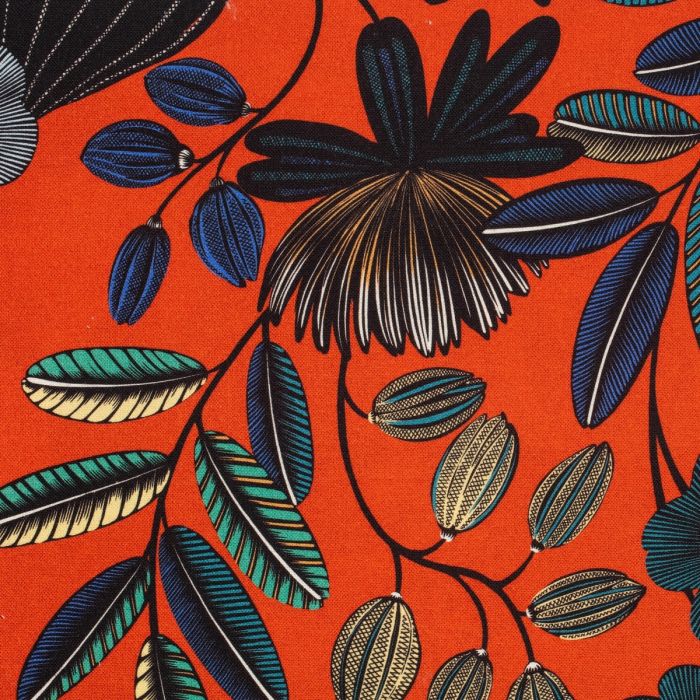 Pour cette variante du dessin Orphée imprimé sur coton, la couleur s’infiltre dans les rainures des motifs, avec du bleu outremer, du turquoise, des jaunes orangés clairs… et éclate en orange puissant de soleil au couchant. Une coloration aux accents africains ou indonésiens, à exploiter dans votre décoration : pourquoi ne pas isoler les différentes couleurs présentes dans le tissu pour des unis coordonnés au tissu Orphée ?