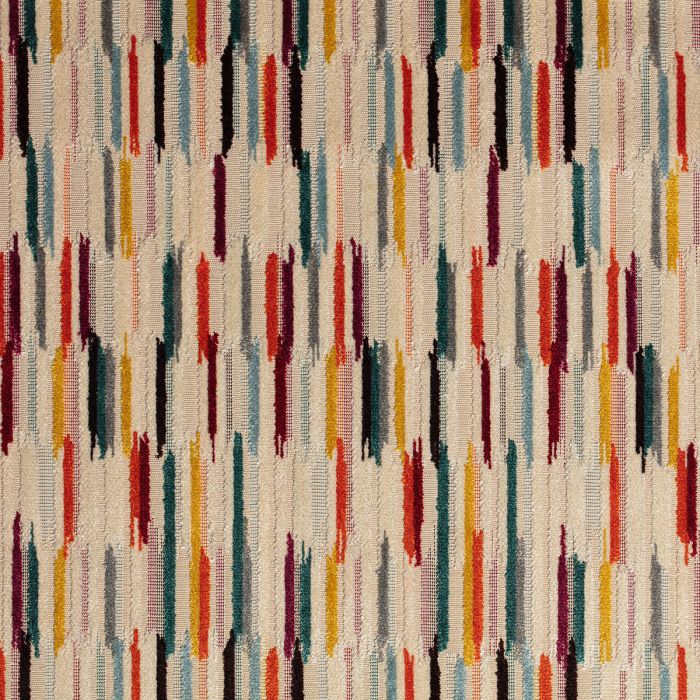 L’espace du tissu se sature de joyeuses hachures multicolores dont la finition dynamique évoque le geste spontané. Une impulsion vitaminée, vivante, arty, qui monte le ton en couleurs comme en tactilité en mixant la sophistication et le relief du velours avec la rusticité et l’humilité du fond beige lin plus en retrait.