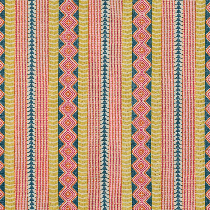 Organisé en bandes verticales (ce qu’on appelle en dessin textile une rayure Pékin), le tissu Kiowa de la marque Romo puise dans une inspiration ethnique ses motifs brodés multicolores. Joie de vivre au programme pour vos rideaux sur mesure, stores bateau ou jetés, en lin, polyester et coton.