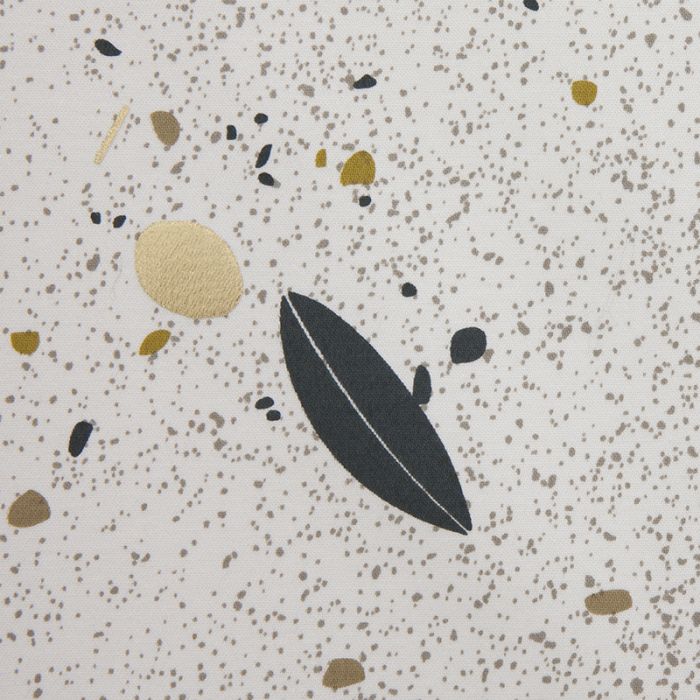 Ce tissu créé par Lelièvre pour sa collection Riviera puise ses inspirations à la fois dans le Terrazzo et la culture méditerranéenne. Le terrazzo aurait été inventé depuis la Rome Antique. Son principe : incorporer des agrégats de matières minérales, comme le marbre, la silice, des éclats de verre ou de nacre dans un liant, pour produire des sols luxueux dont le ponçage fait ressurgir les divers composants sous une forme lisse et brillante. Le terrazzo a été remis à la mode par le groupe de designers Memphis dans l'Italie des années 80 et est devenu un motif transposé à d'autres usages que celui des sols. Le retour du style Memphis dans les années 2010 marque inévitablement le retour du terrazzo. Au motif terrazzo, Lelièvre a ajouté une feuille d'olivier imprimée en or, argent ou cuivre, qui en fonction de l'ombre et de la lumière, fait vivre différemment les pointillés et fragments qui l'entourent. Imprimé au cadre plat sur satin de coton, Oléa se fait la représentation abstraite et légère d'un sol sableux de la Côte d'Azur foulé tout au long de la journée et parsemé de brindilles et poussières. La variante or d'Oléa constitue la plus sobre et neutre de la gamme, très chic avec l'association du noir et du doré.