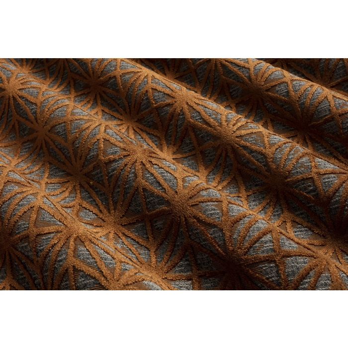 Découvrez le jacquard à décor velours Pharaon bronze, assorti au velours faux uni Sphinx bronze. Ses motifs géométriques structurés et ludiques accrochent la lumière avec des reflets caramel foncé chaleureux. Accord formidable avec les bois tirant sur le roux : acajou, cerisier, merisier. Vous pouvez aussi penser tomettes ou tissus unis couleur terracotta. Le noir ou le bois sombre (noyer) restent une option pour donner de la profondeur et mettre en valeur.